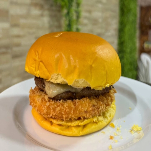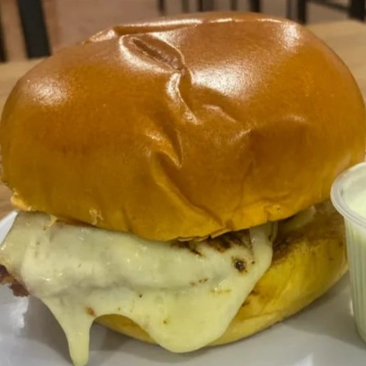 Hambúrguer artesanal, queijo mussarela, maionese e requeijão empanado, servido em um pão brioche.