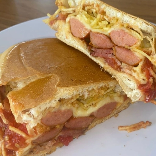 Pão de hot dog, maionese, ketchup, mostarda, tomate picadinho, 2 salsichas perdigão, queijo mussarela em dobro, calabr... Ver completo