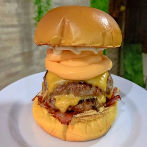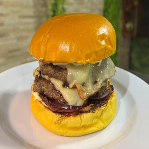 Dois hambúrgueres artesanais (150g cada) suculentos com queijo mussarela, maionese, bacon crocante, cebola roxa e calab... Ver completo
