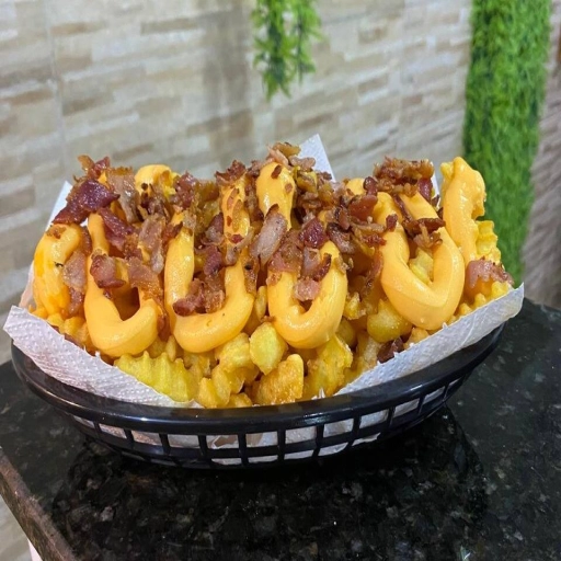 Batata frita crocante e dourada, acompanhada de cheddar cremoso e bacon crocante.