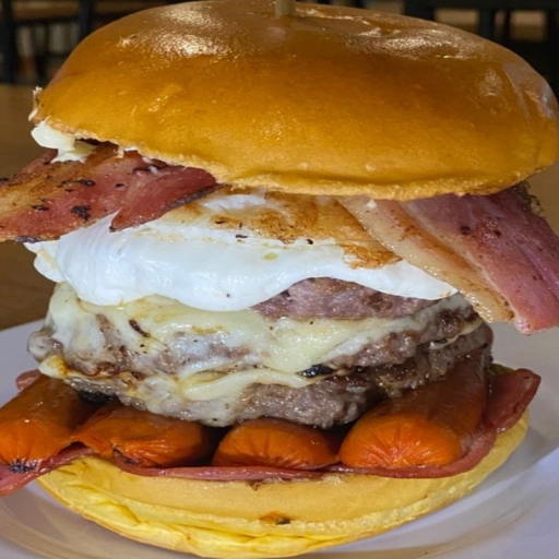 TRÊS hambúrgueres artesanais (150g cada) suculentos com queijo muçarela, maionese, bacon crocante, calabresa, ovo, du... Ver completo